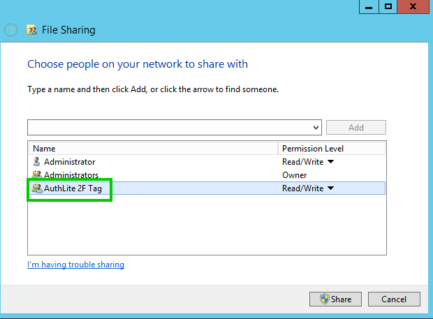 The first method (see Fig. 1) is to remove permissions from everyone except the AuthLite 2-Factor Session Tag group, and any other users or groups you explicitly want to allow without 2-factor authentication. You need to be careful that the AuthLite users are not in any other groups that have access too. It only takes one Allow match for the user to get in. For example if you had a permission that lets Domain Users have access, then they'll be able to get in regardless of their membership in AuthLite or whether they used 1F/2F authentication.